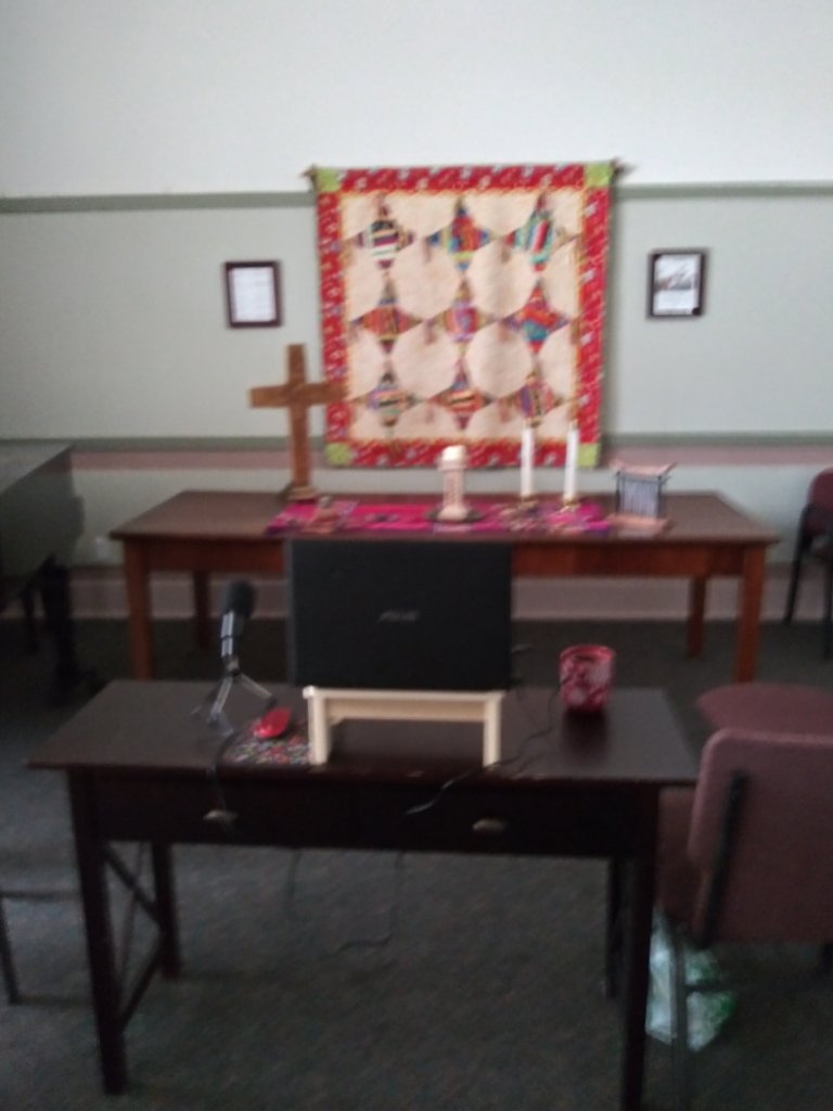 My computer was set up so I was on Zoom and could see people. This was also done so I could do the liturgy from my computer microphone. I had to keep my sound off because there was an echo with the pastor’s computer. We also had a speaker via Zoom for our message, and I couldn’t hear him with the sound off on my computer because the pastor’s computer wasn’t loud enough with me socially distancing from her. I went into the office so I could hear the message with sound on my computer.